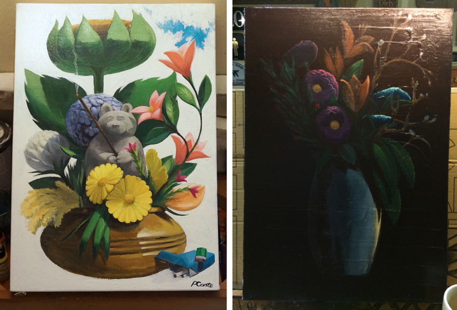 right: Fictional Still Life: Dark. 2017. acrylic on canvas. 14"x 20"